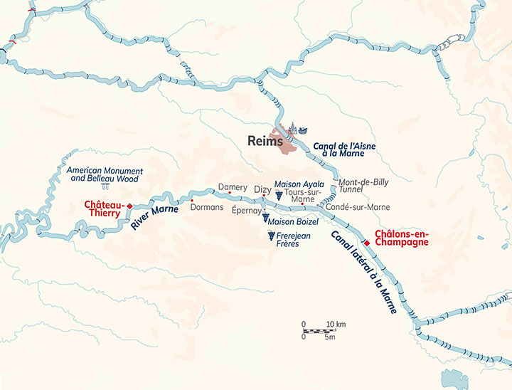 Efter en afslappet morgenmad begiver I jer ud på en privat champagnetur til Frerejean Frères, et eksklusivt grand cru vinhus beliggende i den idylliske landsby Avize, midt i Champagne-landskabet. Undervejs gør I stop ved en malerisk vinmark på bjergsiden, hvor I lærer om de særlige egenskaber, der gør champagnedruen unik. Smagningen hos Frerejean Frères ledsages af en rundvisning i husets elegante rammer, og oplevelsen kulminerer i en udsøgt, privat frokost i familiens salon – en kulinarisk rejse i sig selv. Efter frokosten vender I tilbage til prammen og begiver jer ud på eftermiddagens sejlads. I forlader den livlige Marne-flod og glider ind på den fredelige Canal latéral à la Marne, hvor landskabet åbner sig i stille skønhed. Dagens rejse afsluttes i den charmerende by Dizy, og aftenen rundes af med en festlig middag om bord.