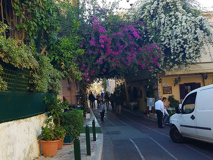 Lige ved foden af Akropolis ligger Plaka, et af Athens ældste og mest charmerende kvarterer. De smalle, snoede gader er fyldt med neoklassiske huse, blomstrende bougainvillea, tavernaer og små butikker, der sælger håndlavede varer og souvenirs. Om aftenen dufter der af grillet souvlaki og moussaka, og man kan høre græsk musik fra de små restauranter. Man møder både både lokale og turister.